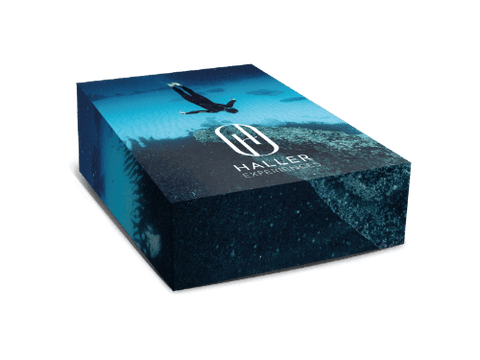 In the Haller Experiences Box you will find the Haller Experiences "resolutions22" hoodie , a Haller Experiences 0.5 L glass drinking bottle and a limited autograph card from Jessica & Johannes . All products are of course vegan and produced fair trade.